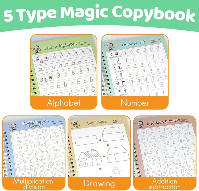 · 【5 In 1 Magic Copybook Set】Inclued 5 Magic copybook for Kids (Addition, Multiplication, Numbers , Alphabet, Drawing) + 1 Pens + 1 Pen Holding Aids + 10 refills. Magic copy books are much larger than other copybooks on the market. Give your children or your friend kids a funny and meaningful gift!